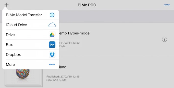 GRAPHISOFT integrated Apple’s Files app in BIMx and BIMx PRO iOS apps to allow downloading and opening BIMx files directly from a 3rd party cloud storage space. Publish the BIMx Hyper-model from ARCHICAD into your Dropbox/Google Drive folder. If you have the cloud storage provider’s app on your iOS device you can enable it in BIMx from the More menu option (see below). By tapping the icon of your storage you can browse through your BIMx Hyper-models and download any of them without leaving BIMx app. Currently iCloud Drive, Google Drive, Box and Dropbox support the Files app functionality.